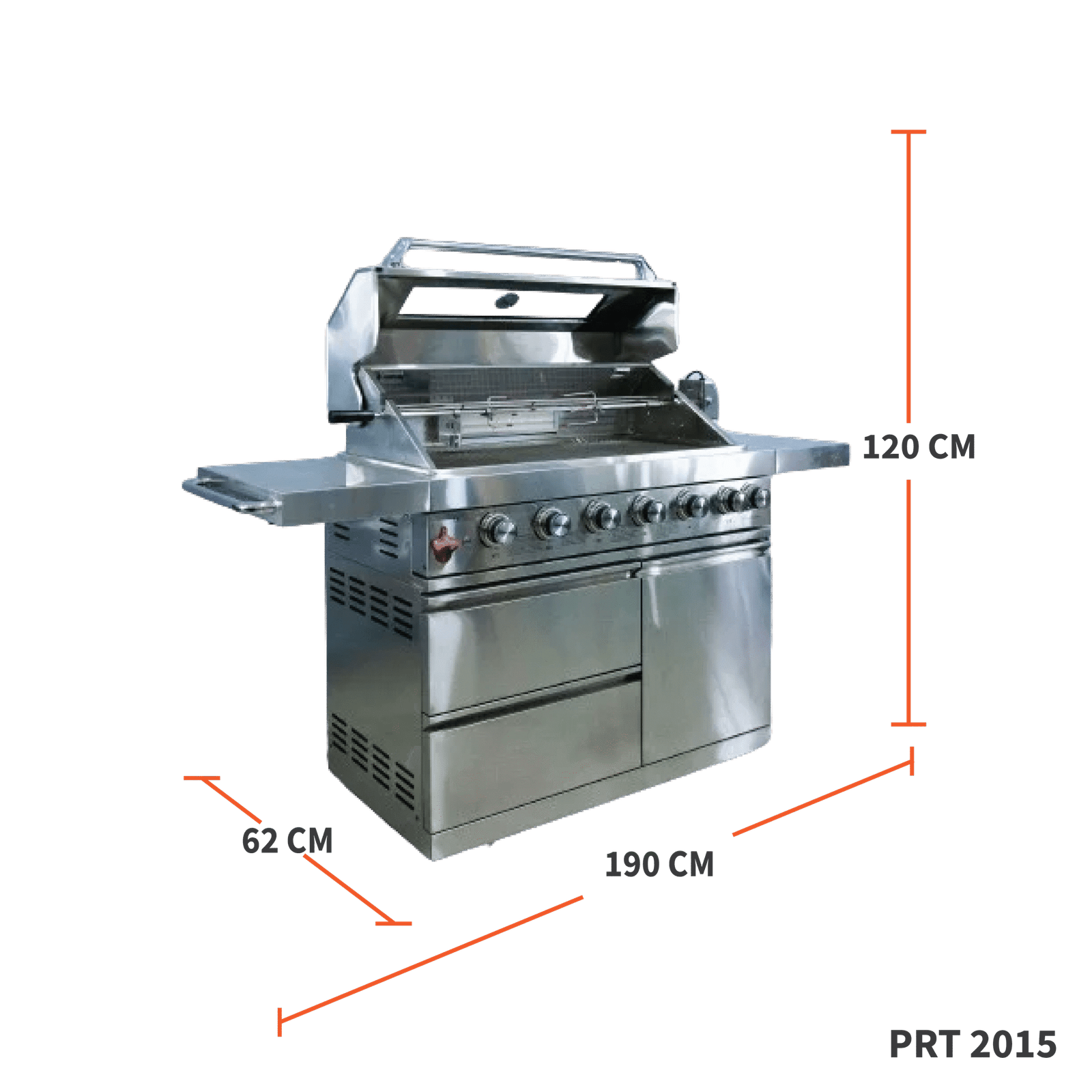 Upgrade your outdoor cooking game with our premium 6-burner gas BBQ. Crafted from durable stainless steel with a sleek black powder-coated finish, this grill boasts a mighty 90,000 BTU heat power. Complete with a convenient side table, rotisserie, 2 drawers, and 1 door, it’s your recipe for grilling success! |